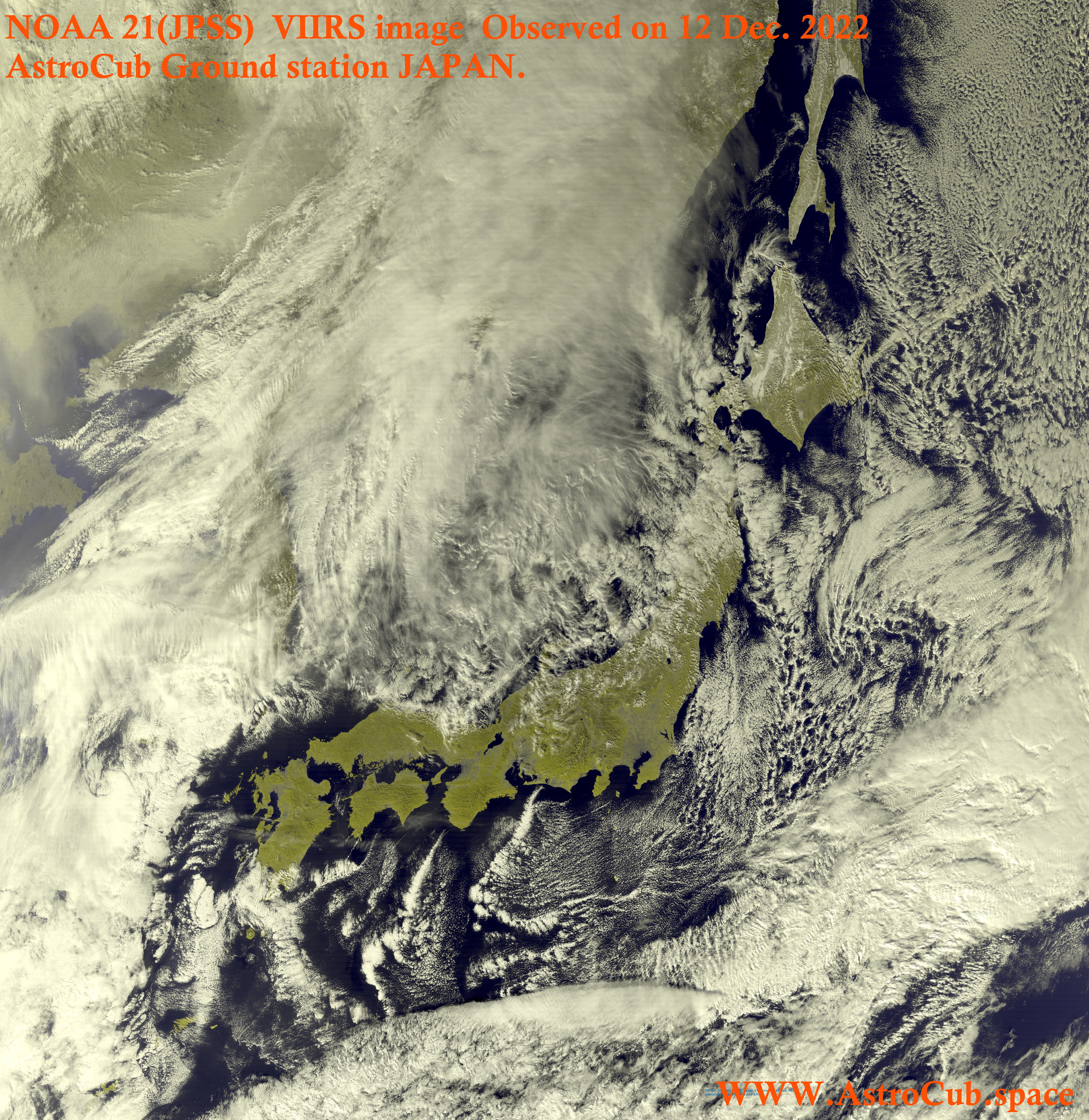 画像は、2022年12月12日に観測された日本付近のVIIRSセンサの画像を可視化処理したものです。(R:G:B=1:2:1) 250m resolution